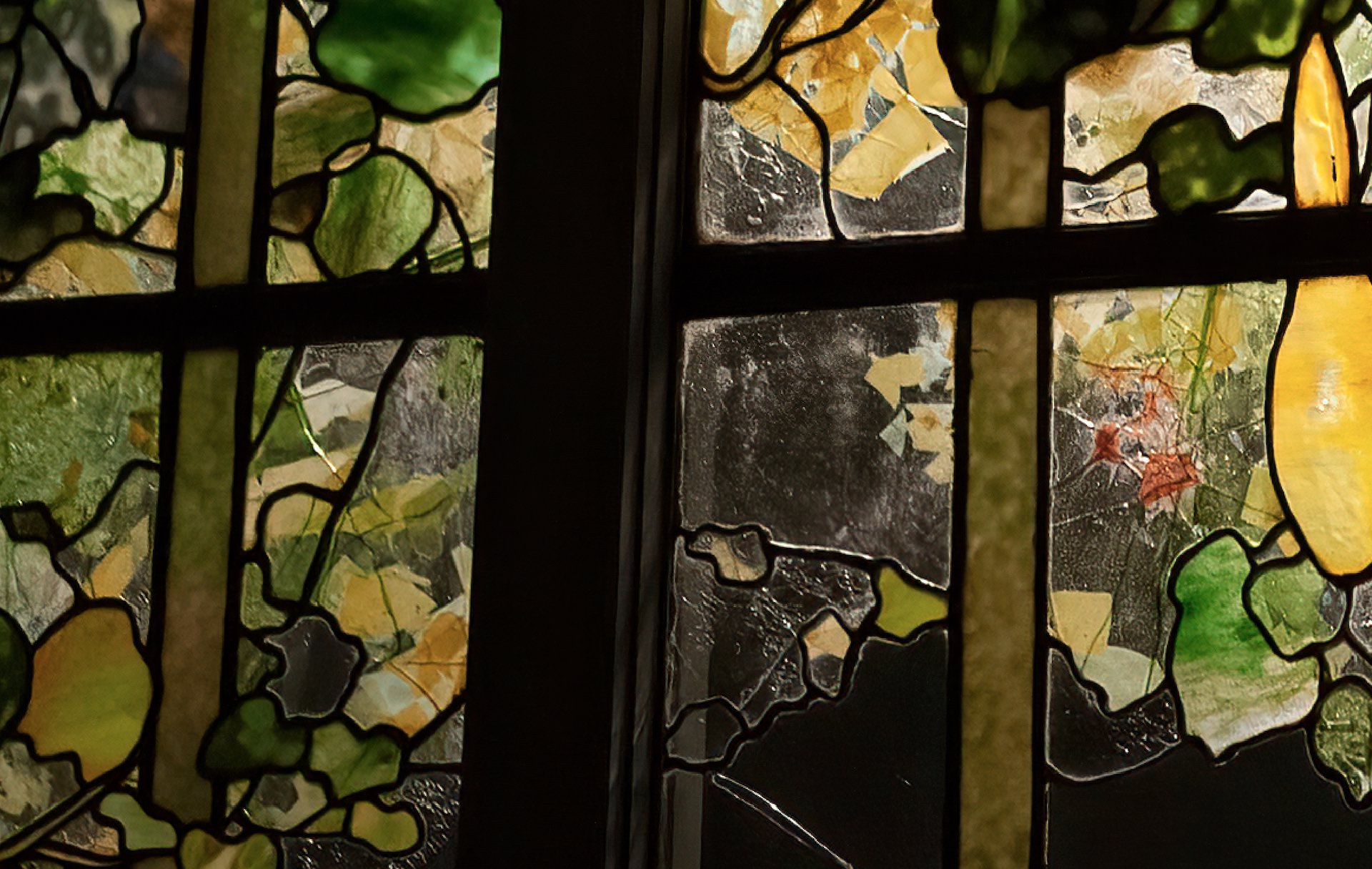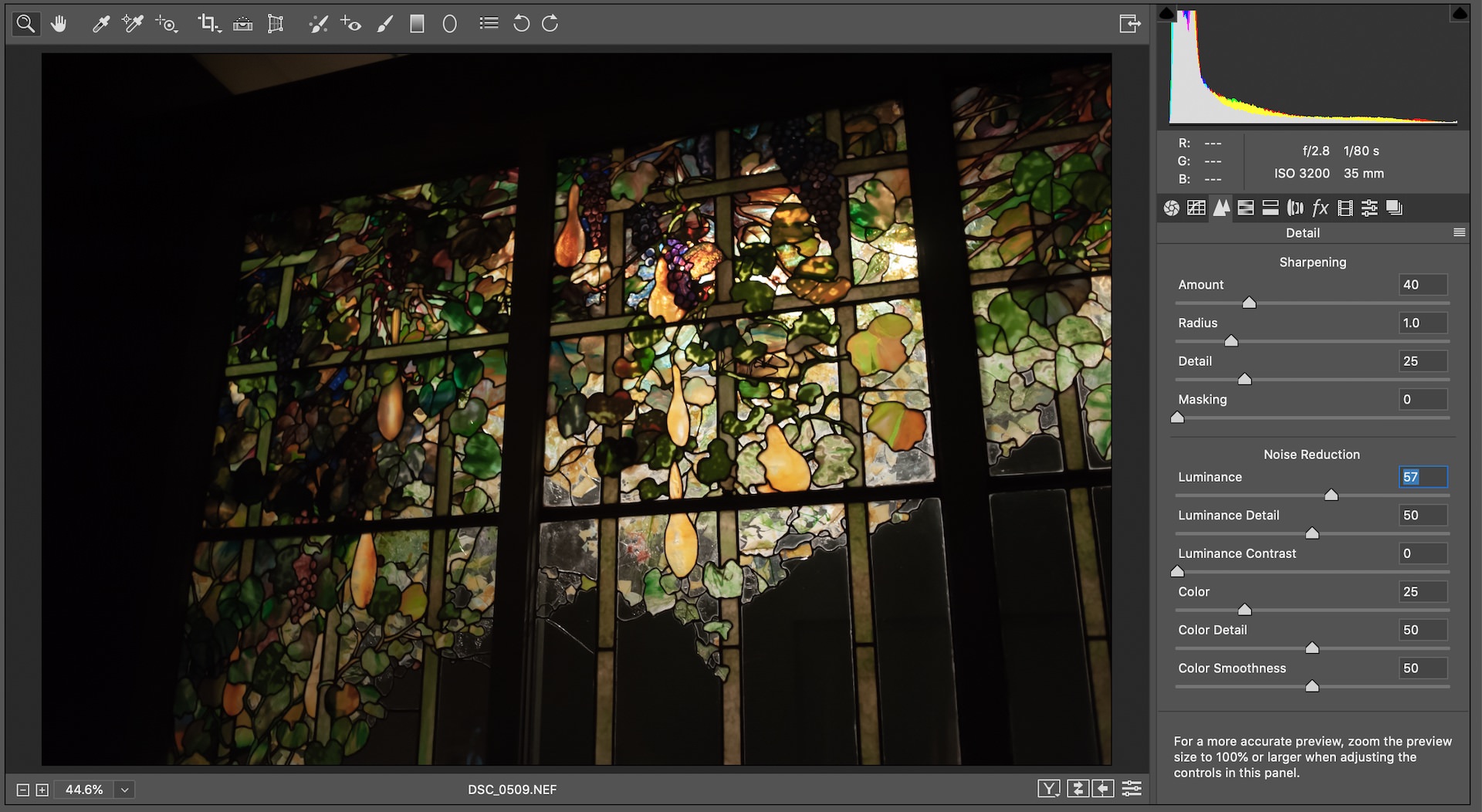 Let's zoom in on a particular area of the image where we see a lot of noise. The beams in the stained glass are particularly dark and have both chroma and luminance noise. Here’s what the image looks like when we open it before applying any noise reduction: