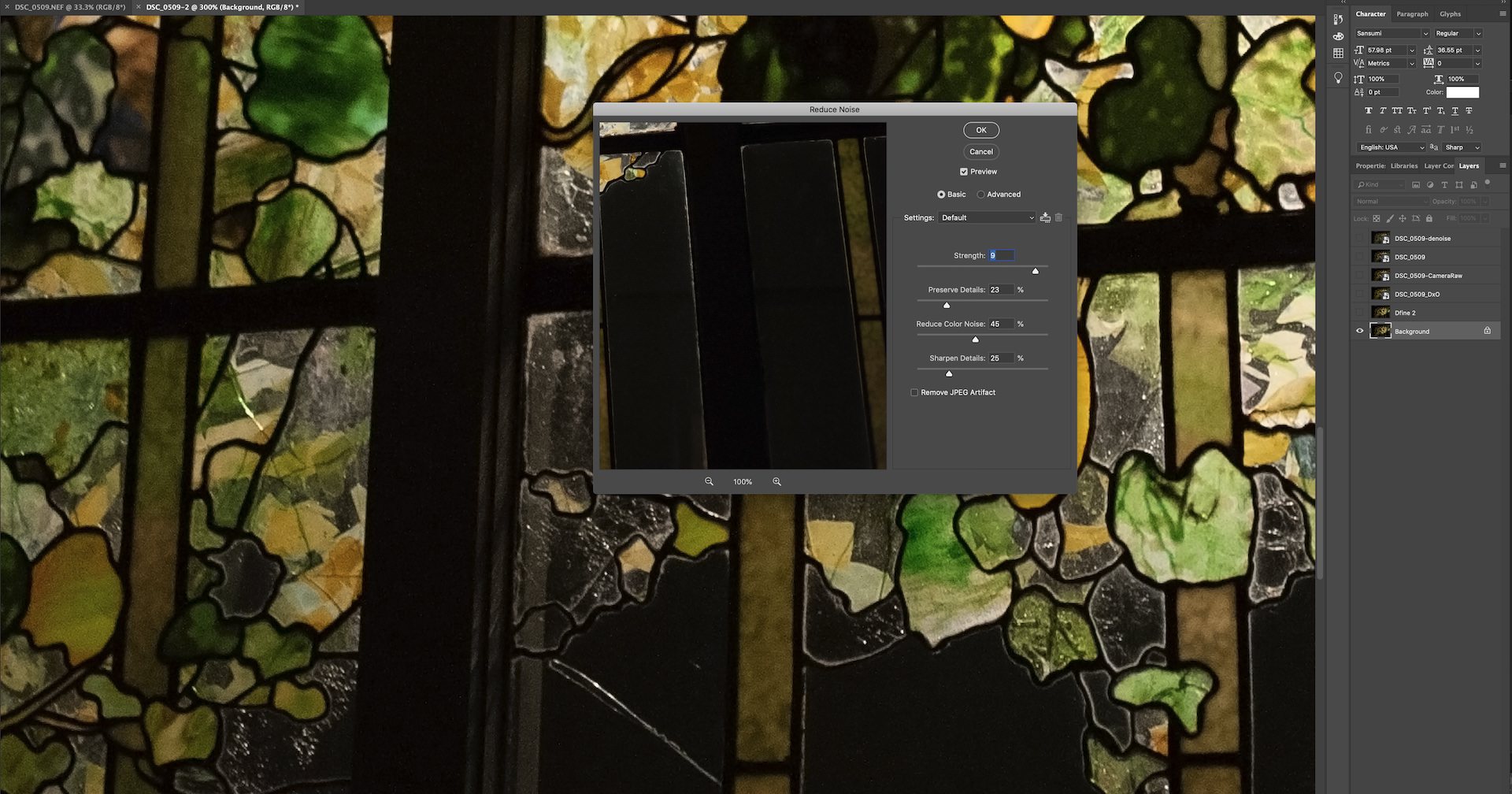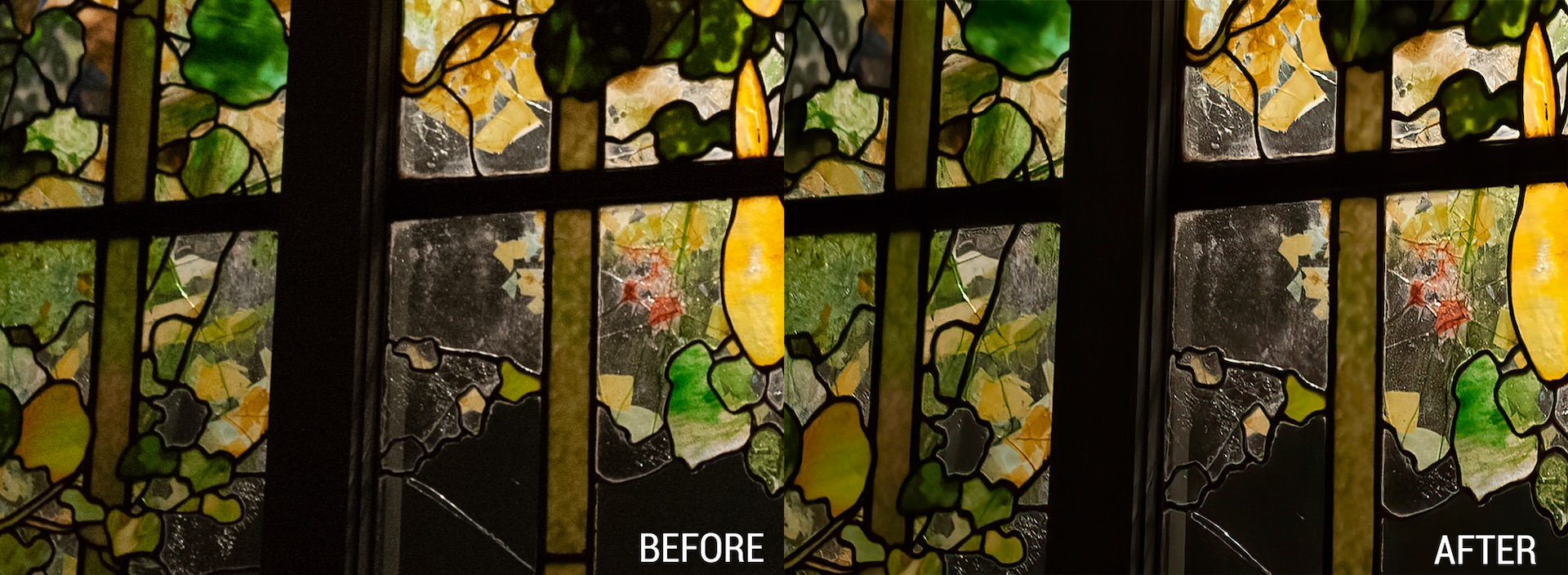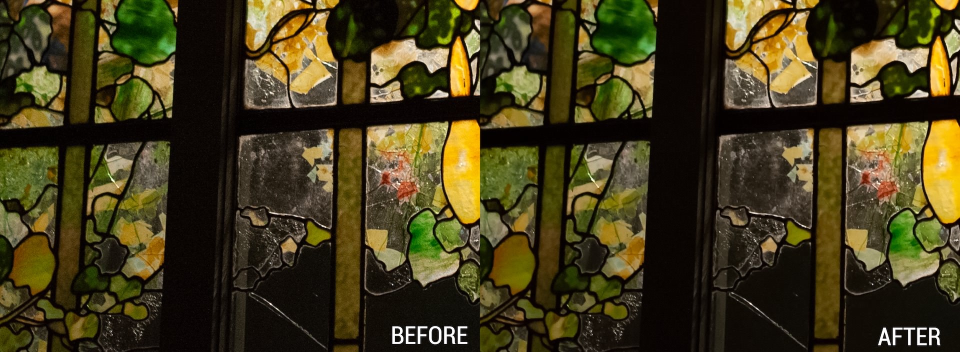 To get the level of noise reduction we were hoping for, we had to almost max out the Strength slider in the Reduce Noise menu. While we reduced the noise in the crossbeam, doing so did not completely eliminate the noise in the colorful sections of the stained glass. It also caused some over-smoothing in the golden parts of the image, taking away some of the fine detail that made the stained glass interesting.