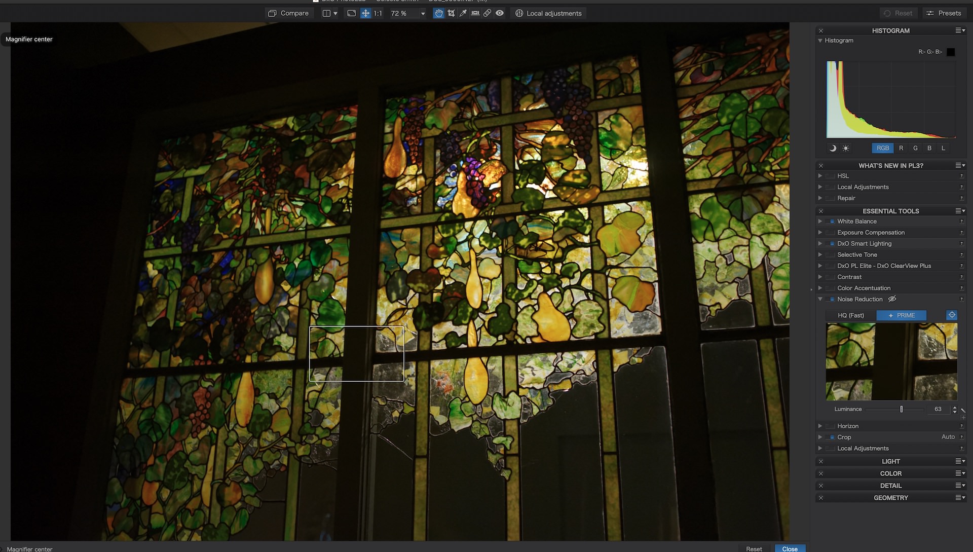 Next, we attempted to reduce the noise in this image with DxO Prime. When you first open an image in DxO Prime, the program automatically gets to work detecting noise. By default, DxO PhotoLab applies HQ(Fast) noise reduction mode as soon as you open an image in the application. Depending on the type of editing you do, this could be a helpful or a frustrating process.