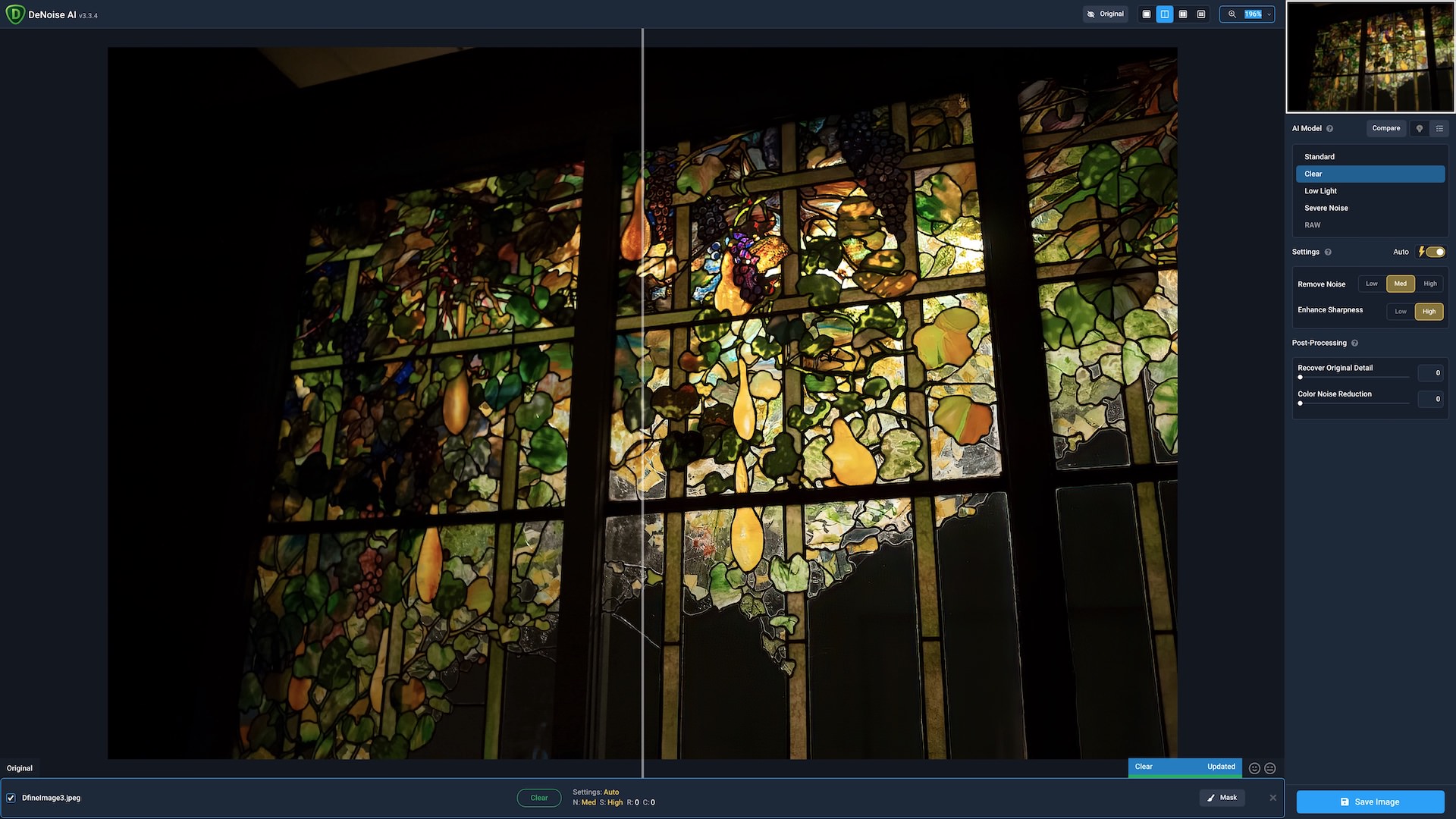 DeNoise AI is simple to use. Upon opening the application, you are given the option to open an image (or multiple images). After opening your image, you are able to select between two models - DeNoise AI and AI Clear. The DeNoise AI model allows for more tweaking while the AI Clear model has fewer settings, but faster rendering. In this instance, AI Clear worked best to clear the chroma noise in our image. You can also choose the manual or the auto options for ease of use (manual will give you more control while auto is a good starting point if you intend to batch process).