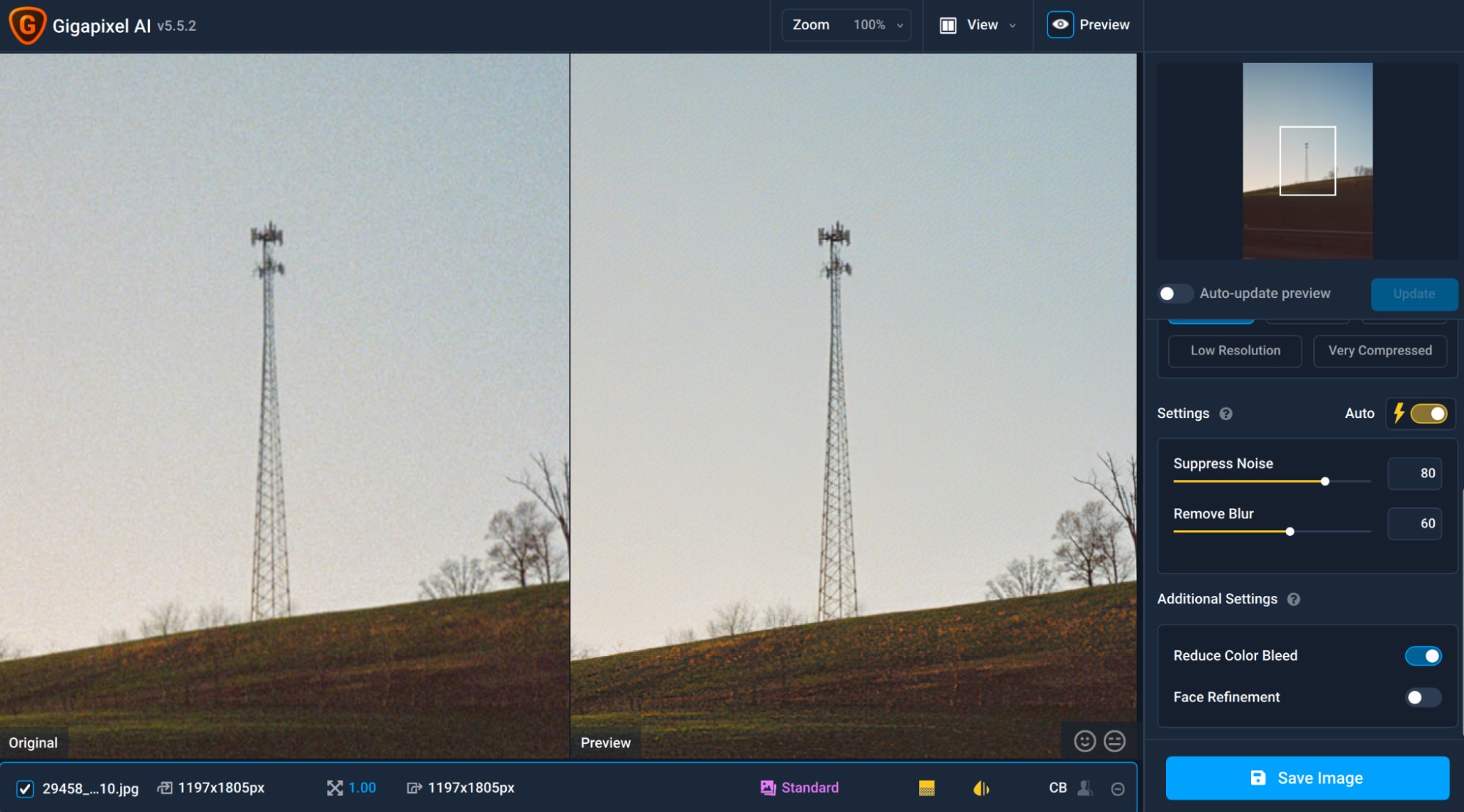 For settings, I generally just use the Standard AI model with auto settings, and change the resolution scaler based on how high resolution my image was initially scanned. Often I’ll use a 2x upscale factor, just so I can properly showcase it on my website.