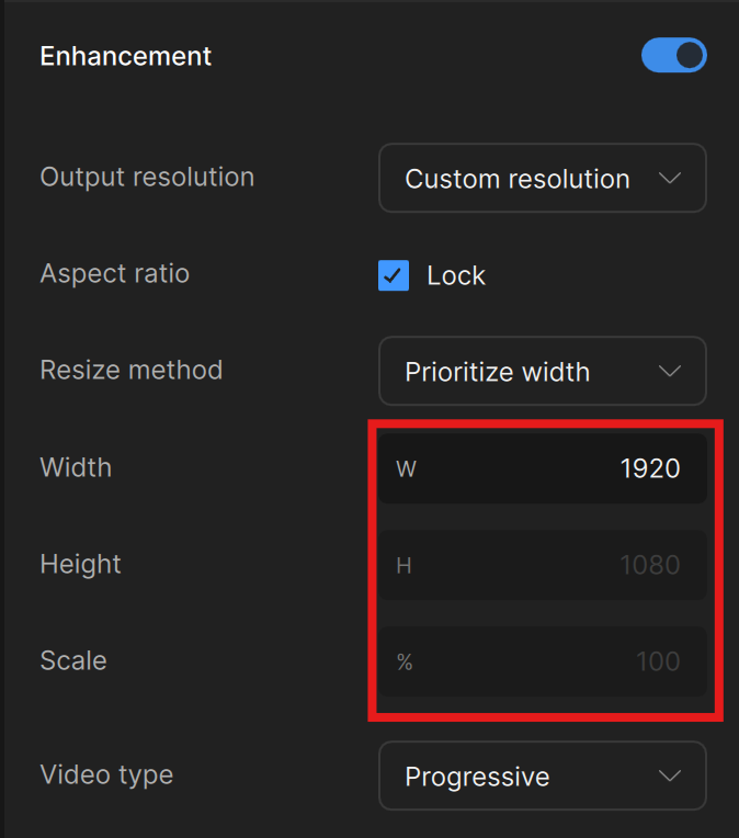 This is especially useful when you need a non-standard resolution. For example, if you want a specific width like 3200 pixels, select "Prioritize width," enter 3200, and the height will auto-calculate. If you need to avoid black bars on an uncommon aspect ratio, you can unlock the aspect ratio and manually adjust the width and height to reach your desired output.