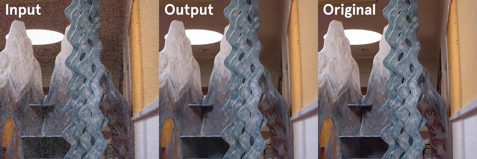 In the example above, the original image on the left has very strong noise and banding artifacts. The DeNoise output is clean and some details are generated in the very dark noise area.