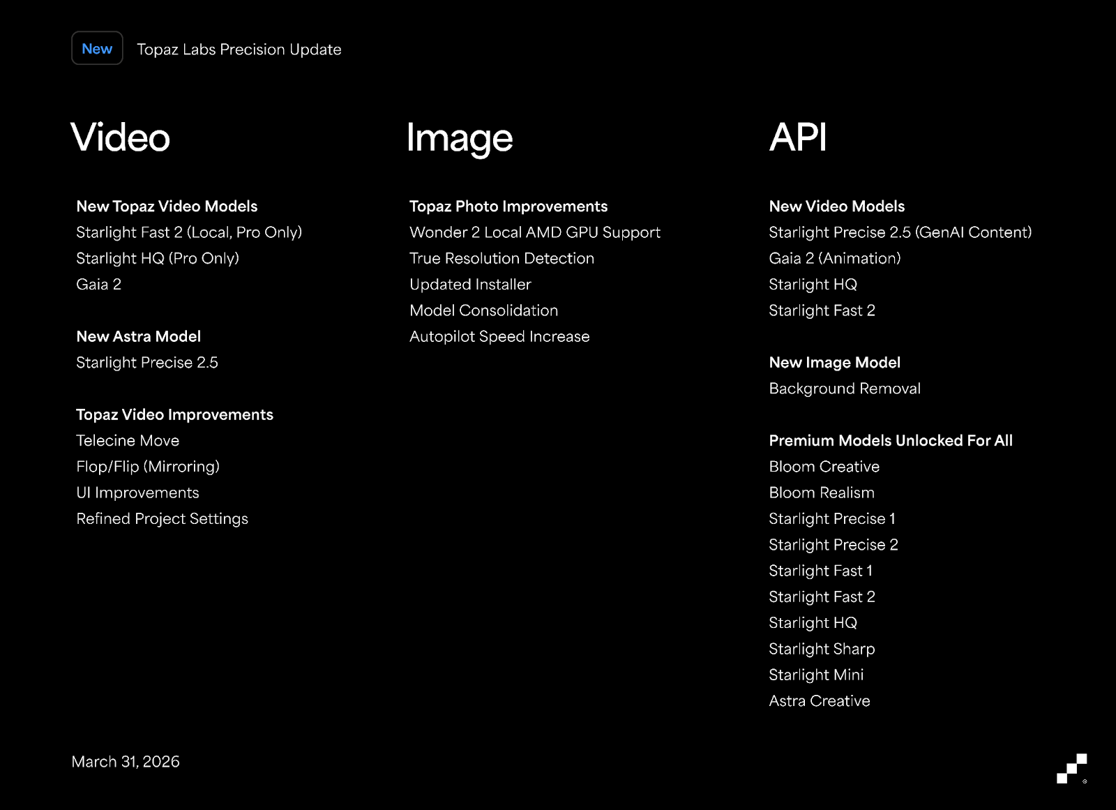 March 31, 2026 - Dallas, TX | Topaz Labs today announced its Precision Update, bringing four new models and nine improvements across its entire suite of tools—all focused on increasing the precision of image and video enhancements like upscaling, denoising, and sharpening.