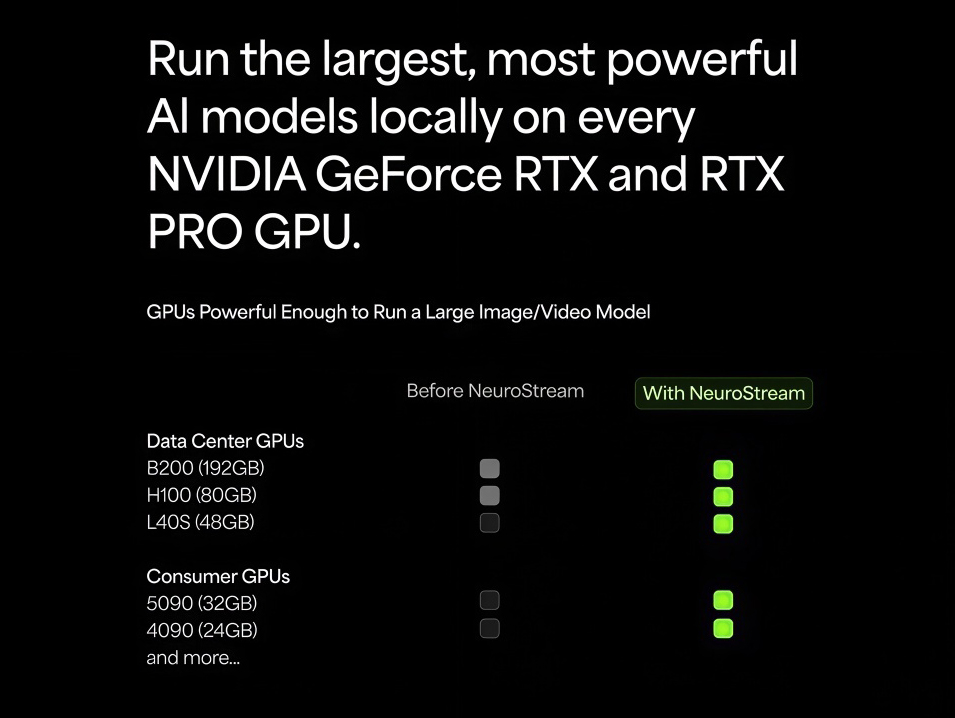 NeuroStream is a proprietary technology that reduces VRAM usage by up to 95%, enabling large, complex AI models to run locally on consumer-grade GPUs without sacrificing performance, speed, or output quality. This breakthrough dramatically expands hardware compatibility, democratizing advanced image and video enhancement models previously limited to high-end systems or cloud-only usage.