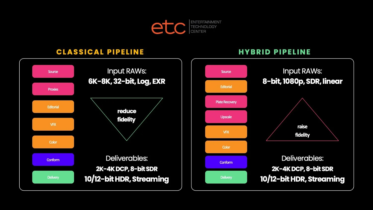 The ETC illustrates this with charts showing how AI production flips the conventional pipeline, forcing post-production to reconstruct robustness that normally exists at capture.