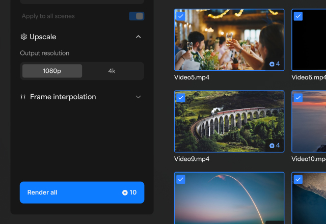 Upload a single video file and apply different enhancement modes to individual scenes to streamline your workflow in Astra.